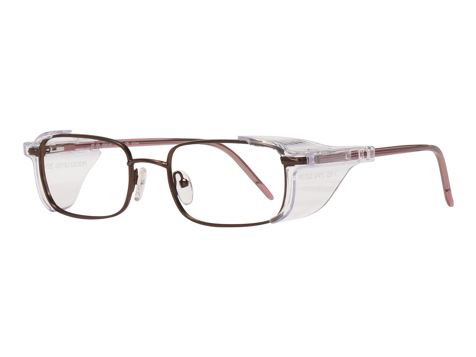 The PENTAX DP720 are metal, prescription safety glass frames featuring spring hinges and adjustable nose pads to help improve fitting. Clear, polycarbonate side shields are included. Meets ANSI Z87.1 standards for high mass & high velocity impact resistance. Side shields must be worn to meet ANSI Z87.1 lateral coverage protection standards. Frame case or pouch included with Rx orders.