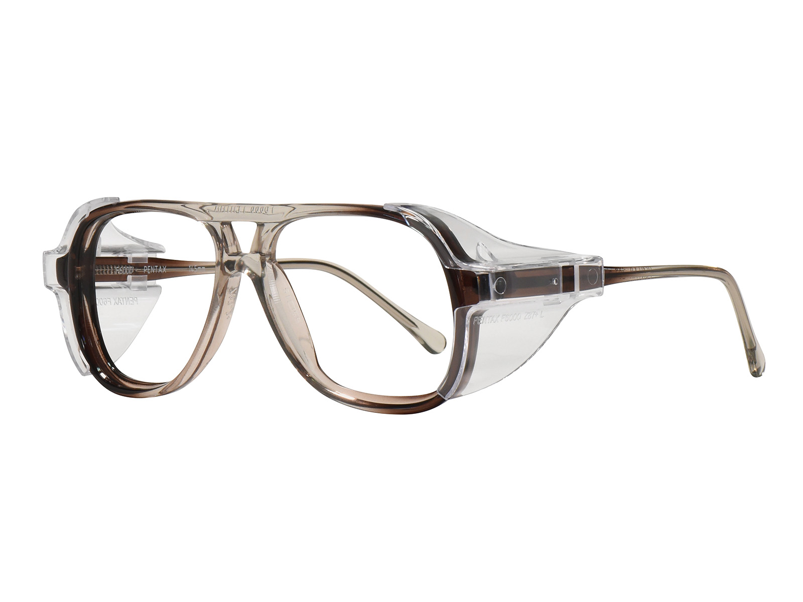 The PENTAX F6000 is a retro styled plastic frame. Clear, polycarbonate side shields are included. Meets ANSI Z87.1 standards for high mass & high velocity impact resistance. Side shields must be worn to meet ANSI Z87.1 lateral coverage protection standards. Frame case or pouch included with Rx orders.